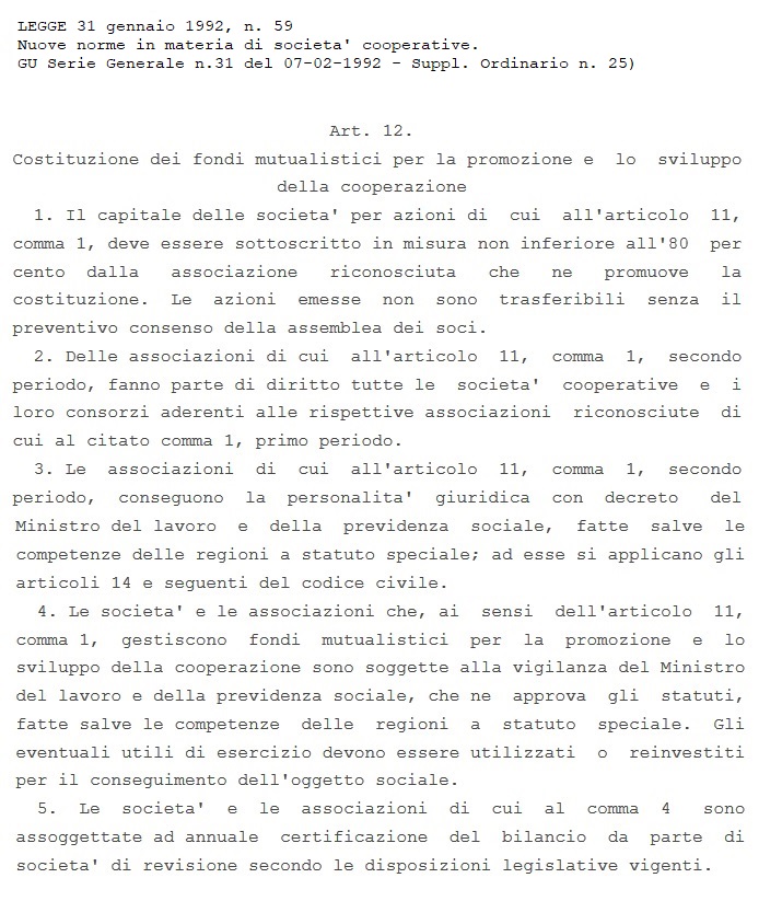 La UNIFOND SPA ha come oggetto esclusivo lo svolgimento dell’attività di promozione e finanziamento di nuove imprese e di iniziative di sviluppo della cooperazione, con preferenza per i programmi diretti all’innovazione tecnologica, all’incremento dell’occupazione ed allo sviluppo del Mezzogiorno, in conformità alle previsioni della legge 31 gennaio 1992 n. 59 ed in particolare degli artt. 11 e 12 in materia appunto di fondi mutualistici per la promozione e lo sviluppo della cooperazione.